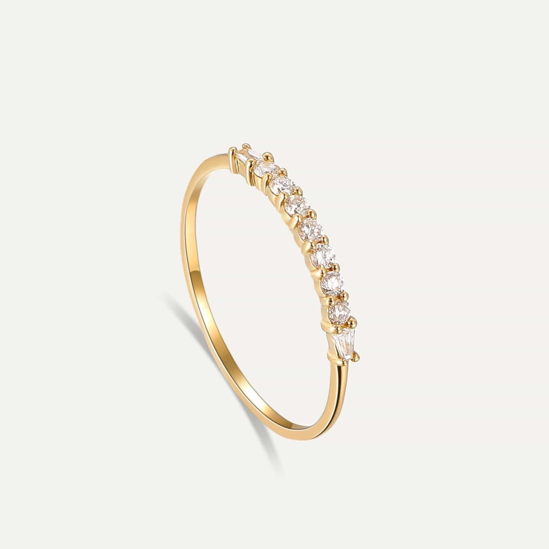 A solid gold ring is the epitome of grace, with the classic glare of diamonds. Gold memoire ring is the classical accessory ornamented with a layer of sparkling diamonds. These diamonds, chosen for their remarkable brightness, give this gold ring a touch of celestial shine, converting it into a gold-diamond masterpiece. The design is a harmonious blend of modish and classic styles. The gold-ring band appears in a refined style, offering comfort without compromising grace. The diamond layer brings a modern edge to the piece, infusing it with the dynamic and radiant energy of a modern woman. Let this 14k gold ring be your go-to accessory every day, whatever the event may be!