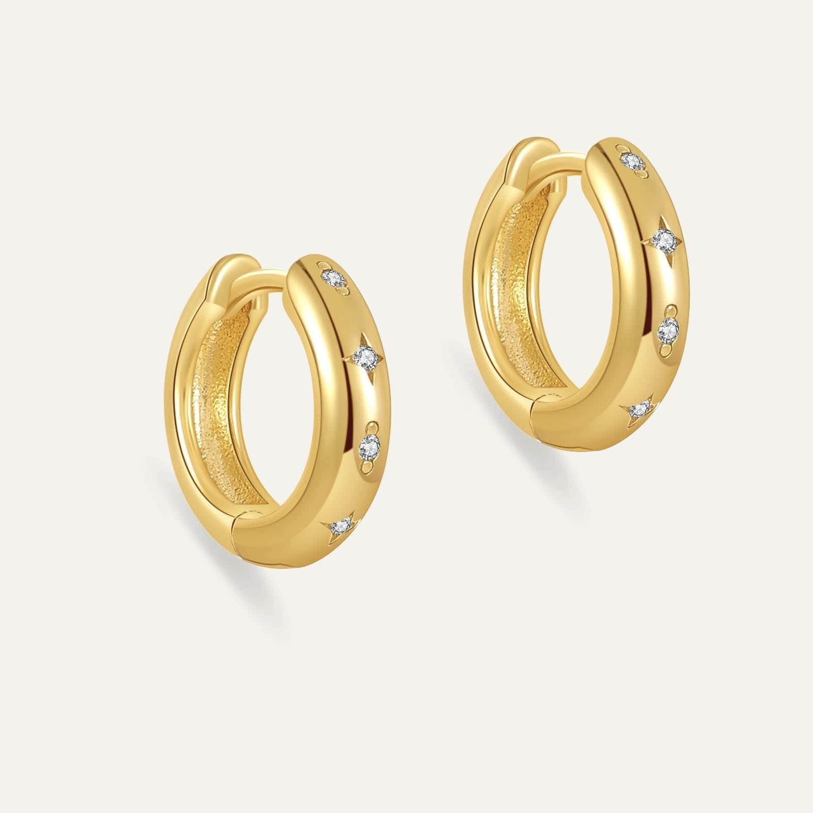 Inspired by the quiet magic of the night sky, the Twilight Mini Huggies are crafted with precision and grace. These gold-plated hoops are adorned with shimmering zirconia star accents, capturing the celestial charm of twilight in a delicate, wearable form.