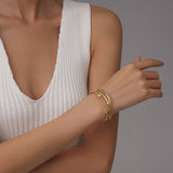 The entwined spiral chains flow seamlessly into a smooth, gold-plated cuff, wrapping your wrist in ethereal beauty. Sparkling zirconia accents further enhance its majestic aura, creating a stunning visual impact.
