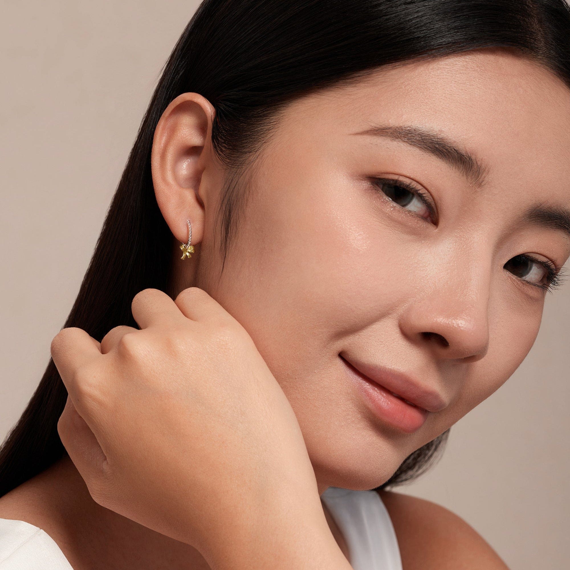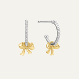 The Celeste Ribbon Hoops feature a beautiful blend of Sterling Silver at the top and 14K Gold at the bottom, creating a perfect balance of elegance and charm. The ribbon design gracefully wraps around the ear, offering a versatile and timeless touch to any look. Whether you wear them casually or for special occasions, these hoops add a refined yet playful edge to your style.