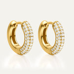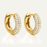 Elevate your gentle aura and add a touch of swag with these gorgeous Pavé Bold Huggies. The radiant gold glow, paired with dazzling cubic zirconia pavé stones, creates a timeless elegance that captivates with every movement.